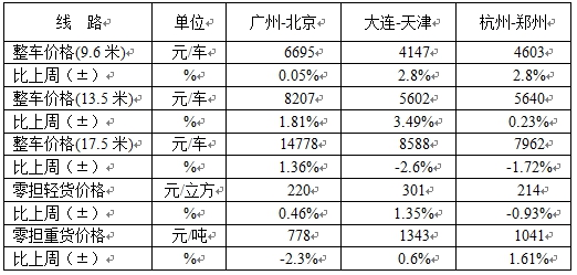 各車型指數(shù)漲跌不一,其中整車指數(shù)環(huán)比回升,零擔指數(shù)環(huán)比有所回落。本周,整車指數(shù)為943.7點,環(huán)比回升0.3%,比上年同期回升2.7%,比年初回升2.0%;零擔重貨指數(shù)為1112.4點,環(huán)比回落0.16%,同比回落3.5%;零擔輕貨指數(shù)為1130.4點,環(huán)比回升0.08%,同比回落0.8%。