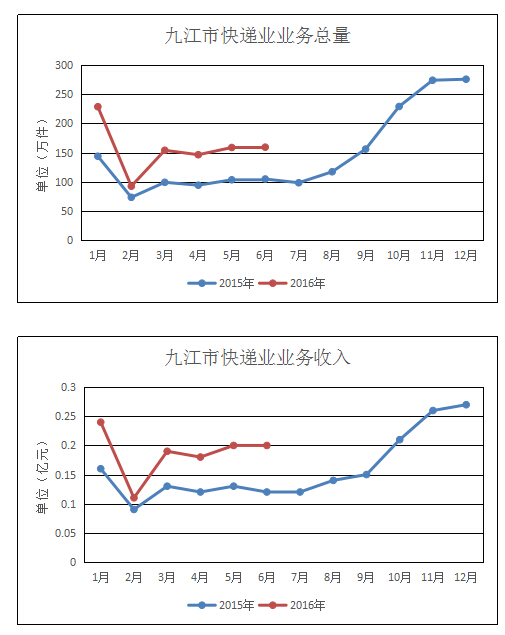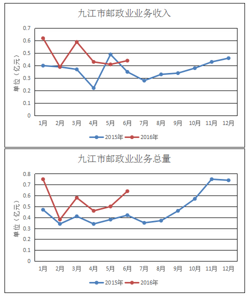 2016年6月,九江市郵政業(yè)業(yè)務(wù)收入(不包括郵政儲蓄銀行直接營業(yè)收入)0.44億元,本年累計完成2.88億元,同比增長29.84%;業(yè)務(wù)總量0.64億元,本年累計完成3.31億元,同比增長40.42%。