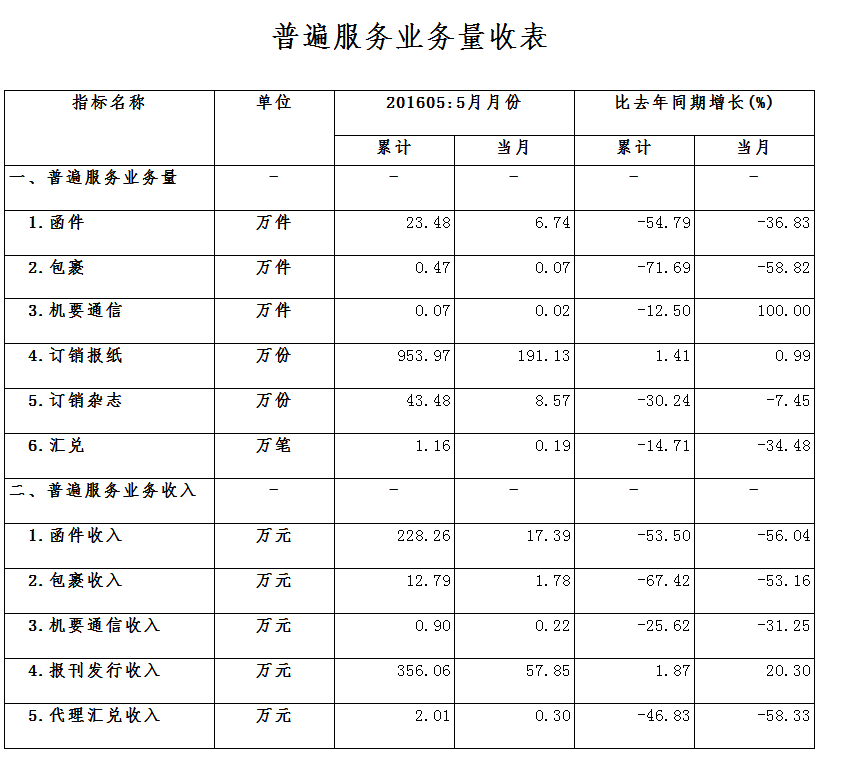 1-5月份,萍鄉(xiāng)市郵政函件業(yè)務(wù)累計(jì)完成23.48萬件,同比下降54.79%;包裹業(yè)務(wù)累計(jì)完成0.47萬件,同比下降71.69%;報(bào)紙業(yè)務(wù)累計(jì)完成953.97萬份,同比上升1.41%;雜志業(yè)務(wù)累計(jì)完成43.48萬份,同比下降30.24%;匯兌業(yè)務(wù)累計(jì)完成1.16萬筆,同比下降14.71%。