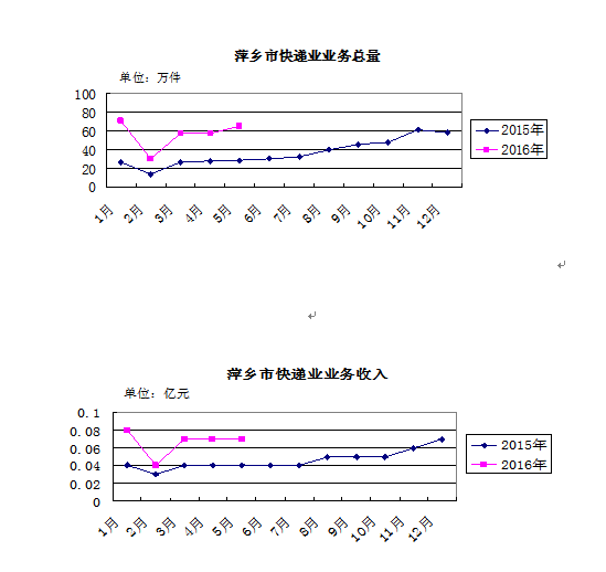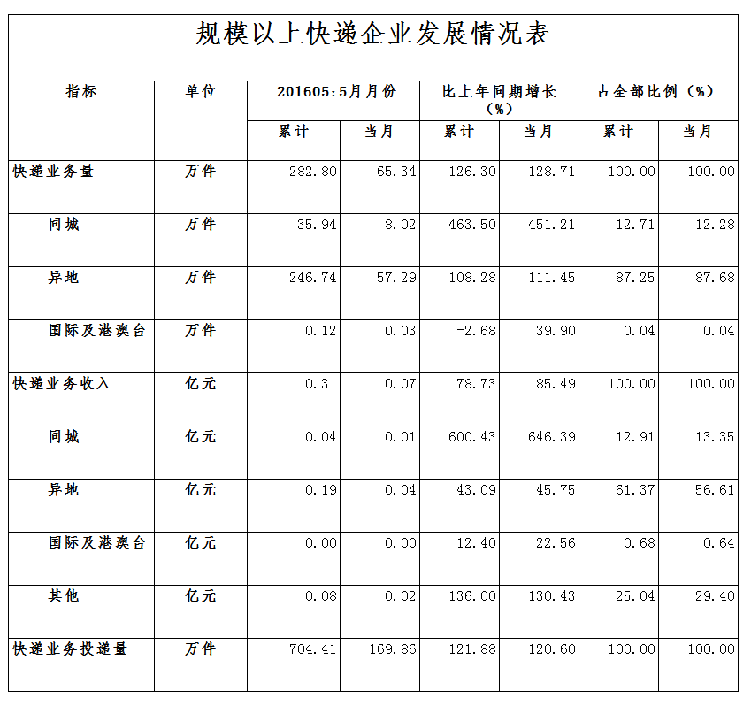 2016年5月,萍鄉(xiāng)市郵政企業(yè)和規(guī)模以上快遞服務(wù)企業(yè)業(yè)務(wù)收入(不包括郵政儲(chǔ)蓄銀行直接營(yíng)業(yè)收入)0.20億元,本年累計(jì)完成1.06億元,比去年同期上升31.62個(gè)百分點(diǎn),全省排第10位;業(yè)務(wù)總量0.25億元,本年累計(jì)完成1.15億元,比去年同期提高54.70個(gè)百分點(diǎn),全省排第10位。