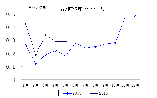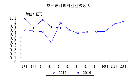2016年5月,贛州市郵政企業(yè)和快遞服務(wù)企業(yè)業(yè)務(wù)收入(不包括郵政儲蓄銀行直接營業(yè)收入)0.84億元,本年累計(jì)完成4.68億元;業(yè)務(wù)總量0.94億元,本年累計(jì)完成5.07億元。