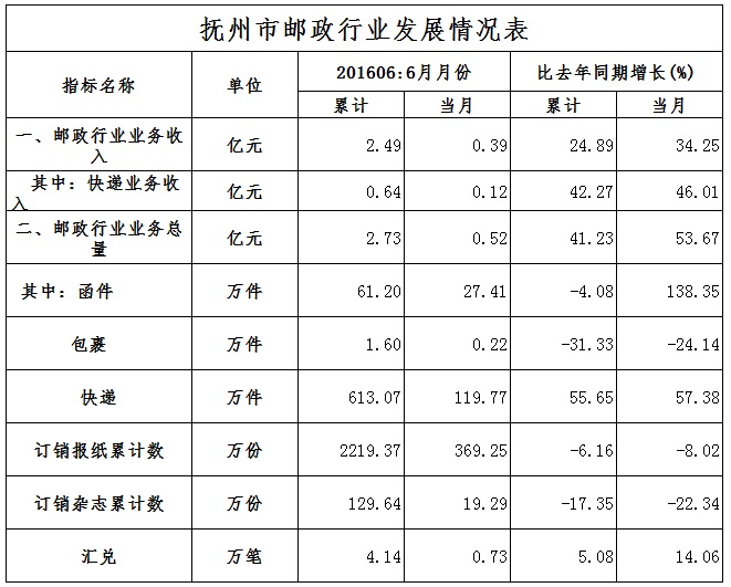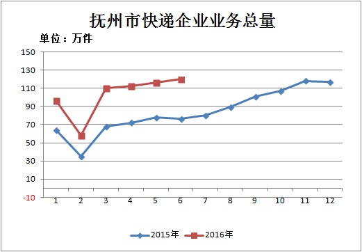 2016年1-6月,撫州市郵政企業(yè)和規(guī)模以上快遞服務(wù)企業(yè)業(yè)務(wù)收入(不包括郵政儲蓄銀行直接營業(yè)收入)累計2.49億元,同比增長24.89%;業(yè)務(wù)總量2.73億元,同比增長41.23%。