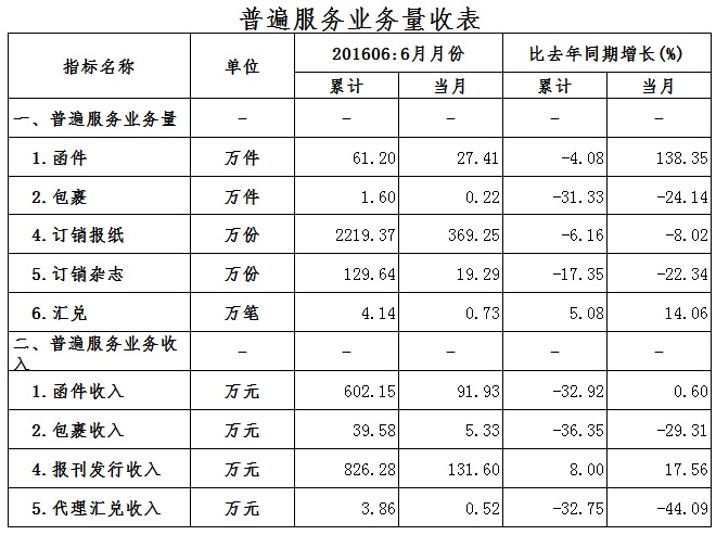 1-6月份,撫州市郵政函件業(yè)務(wù)累計完成61.20萬件,同比下降4.08%;包裹業(yè)務(wù)累計完成1.60萬件,同比下降31.33%;報紙業(yè)務(wù)累計完成2219.37萬份,同比下降6.16%;雜志業(yè)務(wù)累計完成129.64萬份,同比下降17.35%;匯兌業(yè)務(wù)累計完成4.14萬筆,同比增加5.08%。