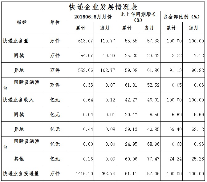 1-6月份,撫州市快遞服務(wù)企業(yè)業(yè)務(wù)量累計完成613.07萬件,同比增長55.65%,快遞業(yè)務(wù)投遞量累計完成1416.10萬件,同比增長61.11%;業(yè)務(wù)收入累計完成6397.84萬元,同比增長42.27%。其中,同城業(yè)務(wù)收入累計完成363.77萬元,同比增長20.47%;異地業(yè)務(wù)收入累計完成4440.05萬元,同比增長39.13%;國際及港澳臺業(yè)務(wù)收入累計完成43.47萬元,同比增長24.95%。