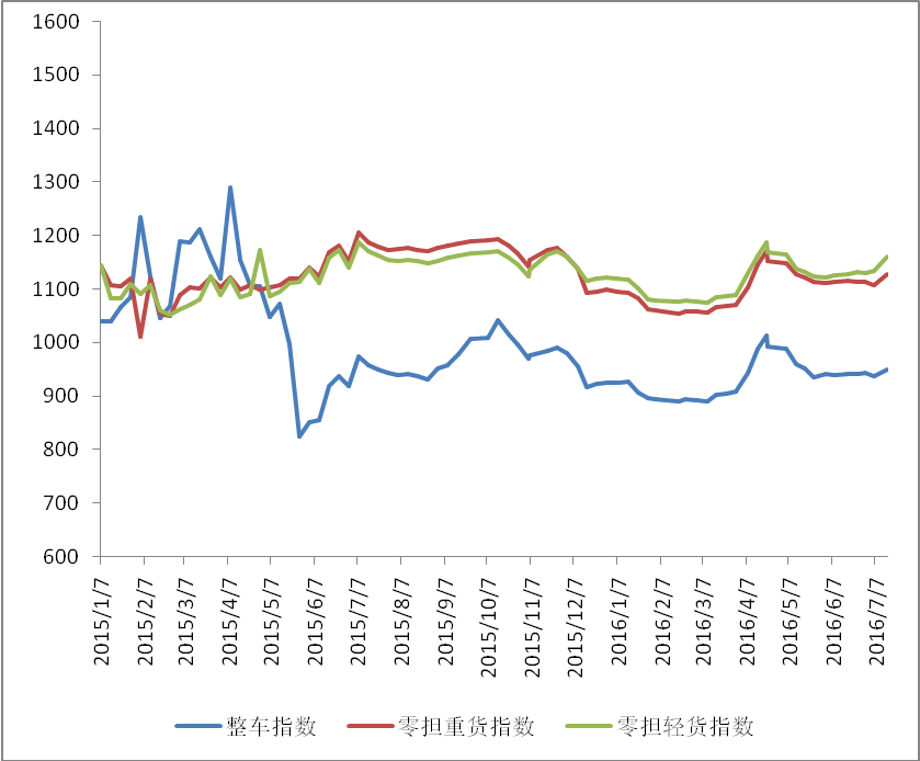 2016年7月11日~7月15日,由中國物流與采購聯(lián)合會發(fā)布的中國公路物流運(yùn)價指數(shù)1027.4點(diǎn),比上周回升1.3%,但比上年同期下降1.8%。
