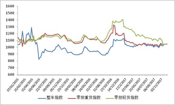 各車型指數(shù)均有不同程度回升,零擔(dān)指數(shù)環(huán)比回升幅度高于整車指數(shù)。其中,整車指數(shù)為1046.9點(diǎn),比上周回升0.02%;零擔(dān)輕貨指數(shù)為1046.8點(diǎn),環(huán)比回升0.14%;零擔(dān)重貨指數(shù)為1048.0點(diǎn),環(huán)比回升0.16%。