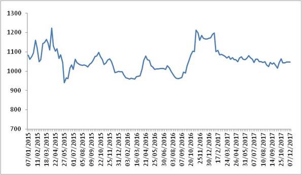 圖 1 2015-2017年各周中國(guó)公路物流運(yùn)價(jià)指數(shù)